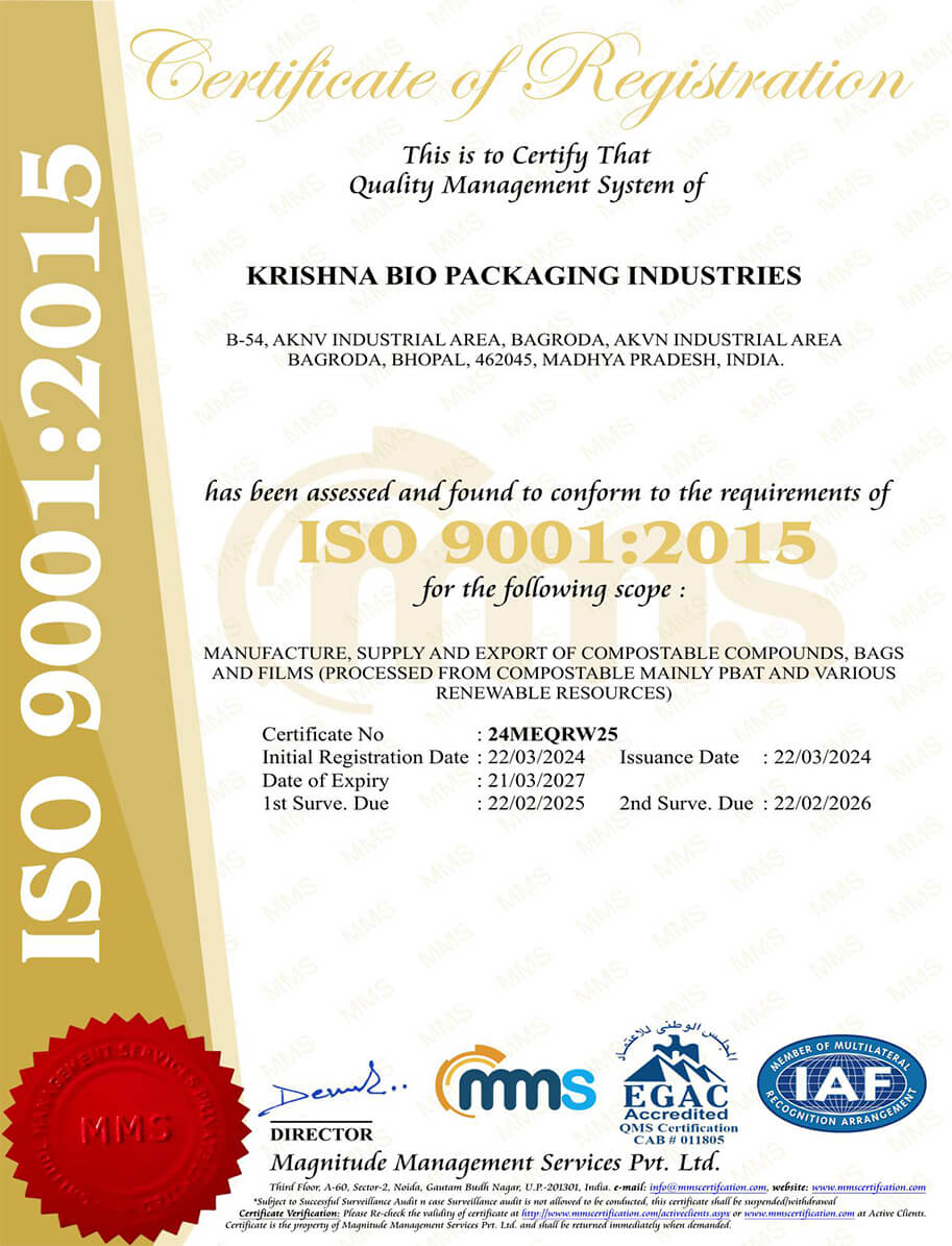 Think Green® bags are made from corn starch and are certified compostable and biodegradable which has proven to be the best alternative of the normal plastic which does not depletes even in 300 years. Krishna Bio Packaging Industries manufactures all it's compostable products as per IS/ISO 17088.
